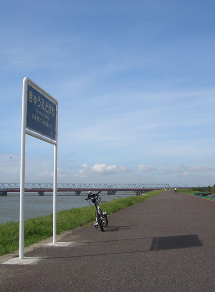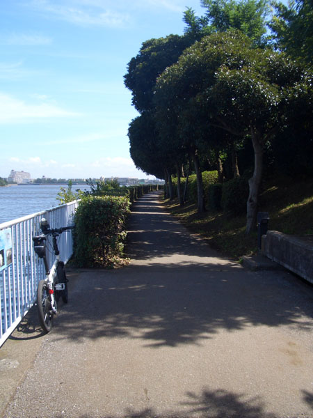 橋を渡り検見川の浜沿いを走行するが砂が飛んできて痛いので橋の下のトンネルをくぐり花見川沿いのサイクリングコースに入ってみる。検見川浜から辨天橋まで約13kmのコースとなっていた。さらに川沿いをさかのぼると印旛沼や利根川までいけるようであった。