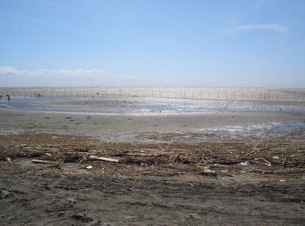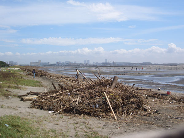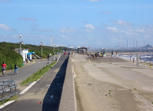 江戸川に架かる市川大橋を渡り原木大橋を渡り二俣交差点を右折するともの凄い向かい風。えっちらおっちらと漕ぎつづけてようやく先端の船橋三番瀬海浜公園に到着した。正午近くとなり気温もさらに上昇して暑いので松の木陰で磯の香りを嗅ぎながらしばらく休憩してから先にいくことにする。海岸は干潟のようになっており潮干狩りなどもできるそうだ。