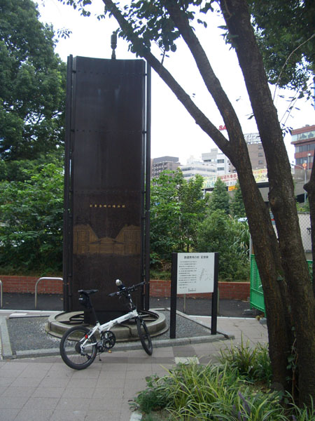 まずは桜木町駅前にあるという鉄道発祥の地の記念碑を探してみる。駅前の広場から少し離れて根岸線の高架沿いに進んで行くと歩道橋の脇あたりにひっそりと建っていた。