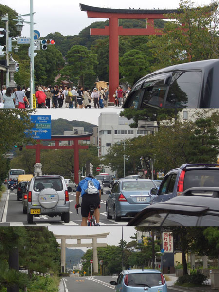 左折して鎌倉街道にでる。ほどなく建長寺前に到着。門の前でしばらく休憩後に八幡宮横を通過して角を曲がると三の鳥居前にでた。予想通り人で溢れていたので駐輪場所を探すが適当なところがないので押していくことにする。右手の池の方にまがり奥へ行くと幼稚園があったのでその側に止めておくことにした。
