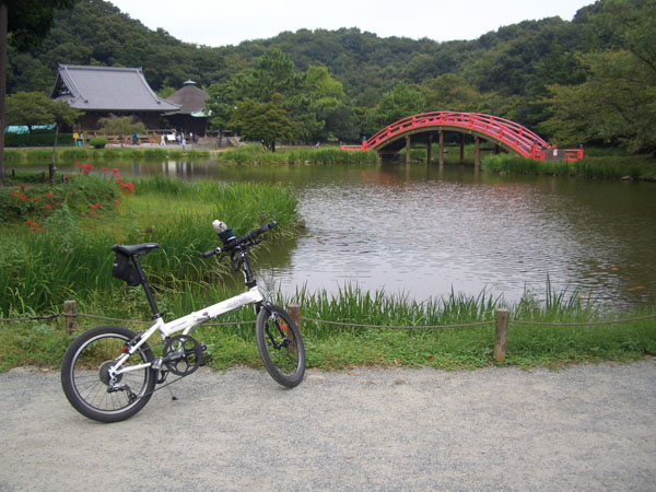 平潟湾の外周をのんびりと走行しながら帰帆橋を渡り州崎町を右折して称名寺に向かう。ゆるい坂道をのぼると正面に赤い門が見えてきた。参道を通り仁王門脇を入ると鮮やかな赤い橋と池が現れた。境内を少し散策して帰路につくことにした。