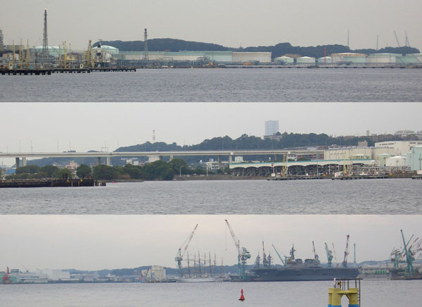 岸壁で釣りをしてる人が大勢いる。根岸湾越しに石油精製工場や三渓園の塔や火力発電所などが見えた。奥へ奥へと進みようやくどんずまりにある海釣り施設に到着した。このあたりからは根岸湾の反対側がのぞめた。