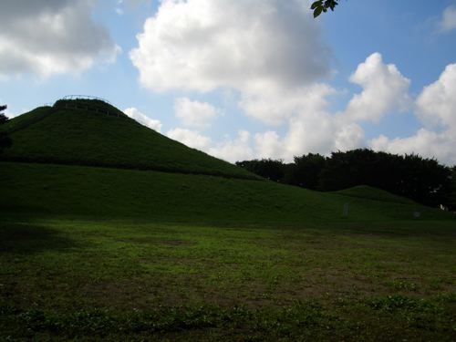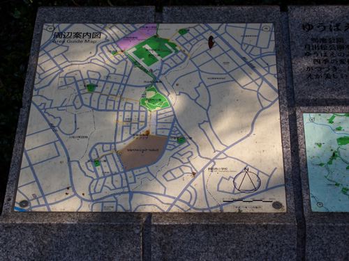 鶴見川から離れてしばらくすると登り坂となりぐいぐいと登っていくと右手の加賀原バス停の横に緑道入口があった。住宅街の坂を登っていくと案内板があったので確認してみる。“ゆうばえのみち”というコースに入るようだ。昨日の雨で石畳み風の路面は少し滑るような感じだったのでのんびりと走行することにした。蝉しぐれがすごくまさに真夏という感じだ。坂を登っていくと川和富士公園というもっこりと盛り土がしてある展望台のある公園に到着。少し休憩する。