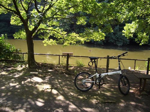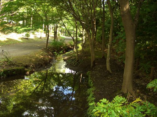 更に先へ行くと道が分岐していて左へいくと都筑中央公園、右に行くと“ささぶねのみち”となっていたので右の“ささぶねのみち”へと進んだ。葛ヶ谷公園、大原みねみち公園、茅ヶ崎公園と通過し、せせらぎ公園へと向かう。このあたりは森の中を走行しているようで道の端にはせせらぎがあり気持ちよく走行することができた。いつのまにか“せきれいのみち”に進入すると、池と菖蒲と古民家のあるせせらぎ公園に到着した。ここは人影も多く人気のある公園のようだ。