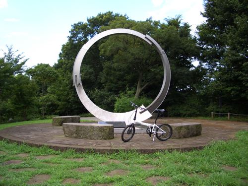 この先は住宅地と一般道を通る“やさきのみち”と川沿いの“しらさぎのみち”とに別れていたが“やさきのみち”へと進む。少しうろうろしながら矢先橋を渡ると都筑中央公園に辿り着き無事緑道一周を果たすことができたようだ。都筑中央公園のばじょうじ谷戸から急な上り坂を登りステージ広場に辿り着く。さらに上の展望広場まで自転車を押して歩いた。丸い輪のモニュメントがある。今ひとつ眺望はよくなくステージ広場に引き返して遅い昼食をとることにした。