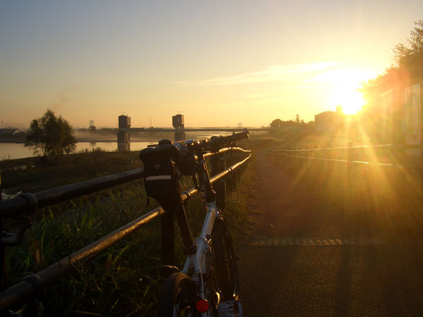 薄暗い綱島街道を走行していき丸子橋に着く頃には薄明るくなってきた。丸子橋付近の少々走行しにくいコンクリート舗装の区間を通過して土手に上り等々力付近の休憩所で休憩。川原は朝靄につつまれていて少し幻想的だった。この時期寒いせいか鼻水がたれてきて困る。