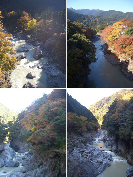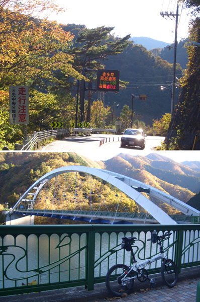 このあたりから少しペースを落としてのんびりと走行していくことにした。短いトンネルを抜けるとほどなく御岳渓谷に到着。駐車場の脇をとおり川原方向におりていこうとすると管理人らしい人に「自転車は降りちゃだめだよ橋の上に止めて徒歩できて」と言われてしまったのであきらめて仕方なく御岳橋に向かう。渓谷はだいぶ紅葉しているようだった(見頃は来週末あたりか)橋の上から眺めたあとに先に進むことにした。時計を見ると時刻は10時近くを差していた。