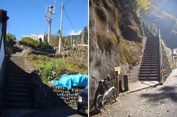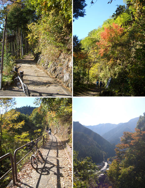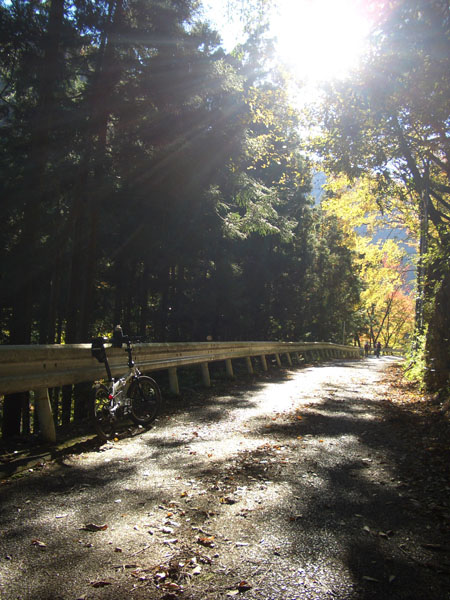 氷川大橋を渡ってほどなくすると右側に奥多摩むかし道の案内板がたっていたので確認してみる。指示板どおりすぐに左折するといきなりの激坂(羽黒坂)となっていた。半分ほど乗車してすすんだがノーマル仕様のギヤ比(53T×32T)では脚の筋を痛めそうなので押してのぼることにした。紅葉時期ともありハイカーが結構歩いていたし道も狭いのでのんびりと押していくことにした。