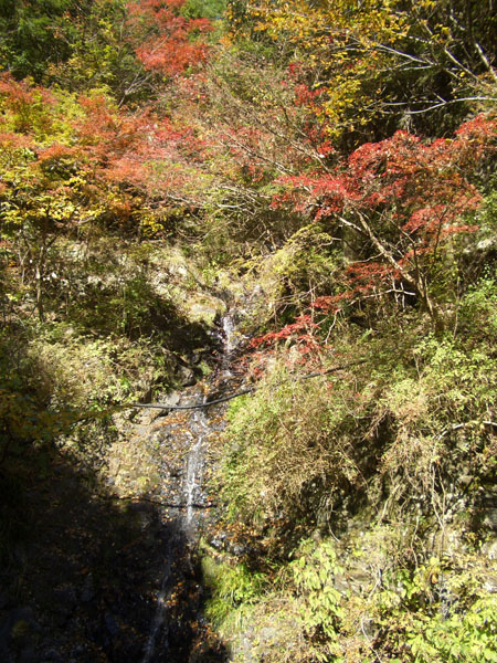 ほどなく不動の上滝という案内板のある場所に到着。ここにはトイレもあった。さらにすすむとちらちらと渓谷が顔をのぞかせる。この辺りから道のとこどころに紅葉した木々が散在していて綺麗だ。