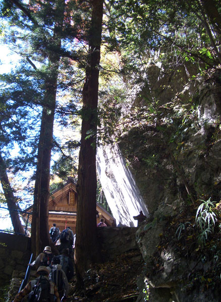ほどなく白髭神社に到着。巨大な岩肌が露出しており今にも神社の屋根が押し潰されてしまいそうになっていた。ちょうど昼時だったのでせまい境内ではハイカーが弁当を広げていたので早々に退散する。このあたりは銀杏の実を踏みつぶした時の独特の匂いが漂っていた。