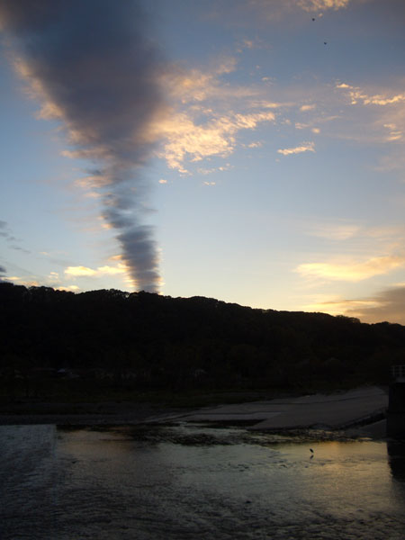 青梅街道で御岳駅前まで走行し御岳橋を渡り吉野街道にでて寒山寺駐車場で休憩後一気に羽村堰までノンストップ。すでに日も暮れかけており空にはなんだか不思議な竜巻のような雲が…。