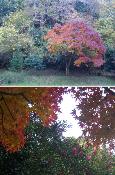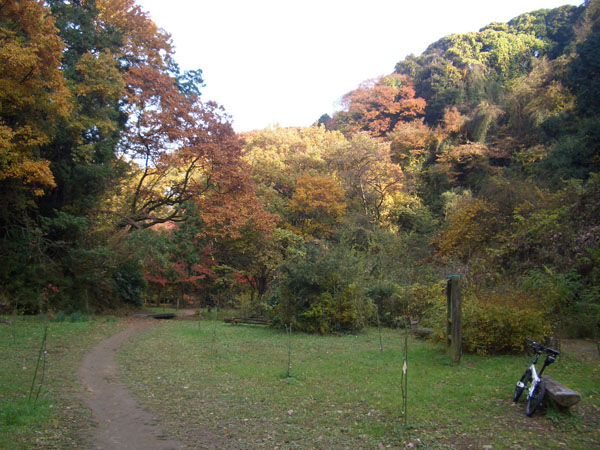 広場から急な階段を下っていく(自転車は置いて徒歩で…)。途中中ほどに休憩所(ベンチ)があった。さらに下っていく。池はどこにあるのかと探すが湿地のようなものがあるだけであった。(帰ってから調べてみると広場から横の階段を上っていくようであった)広場の紅葉はちょうど見頃な感じでまずまず綺麗。
