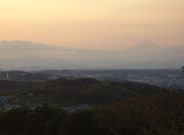 彼方に箱根や湘南の海が逆光の中ぼんやりと見えていた。しばらくすると富士山もぼんやりと見えてきた。夕景色を30分ほど眺めていたが日が山陰に沈んだところで少々寒くなってきたので帰路に着くことにした。