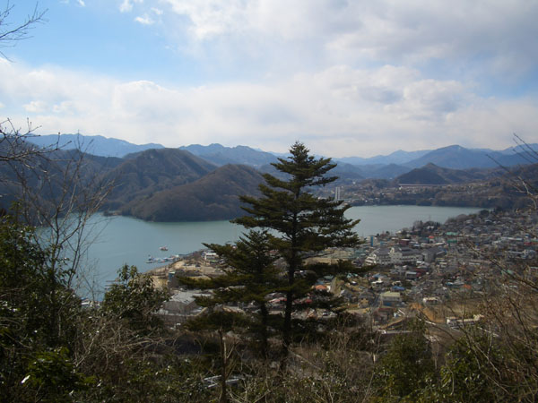 休憩後に相模湖大橋を渡り発電所方面に曲がる。嵐山登山口前の四阿付近に駐輪して登ってみることにした。落ち葉が堆積していて結構すべるので気を遣いながらゆっくりと登っていくと少し開けた場所にでた。右手に相模湖と山の連なりが見晴らせた。