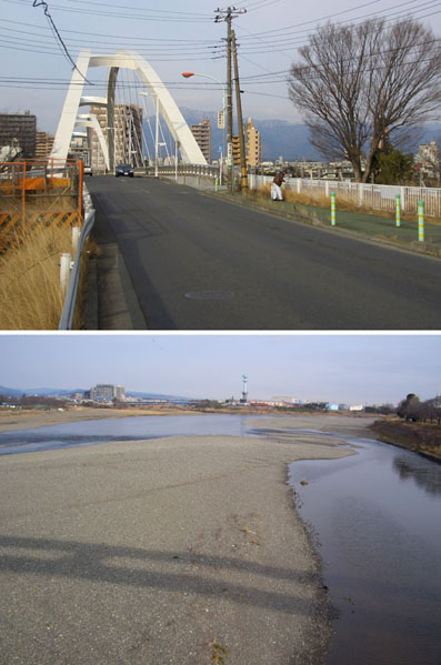 坂道を下り海老名市街を抜けて陸橋を渡って踏切を越えて大きくカーブ(直角)してあゆみ橋入口で右折すると相模川に架かるあゆみ橋に到着。ここまで約2時間ほど(約30km)でヤビツ峠とのほぼ中間地点。