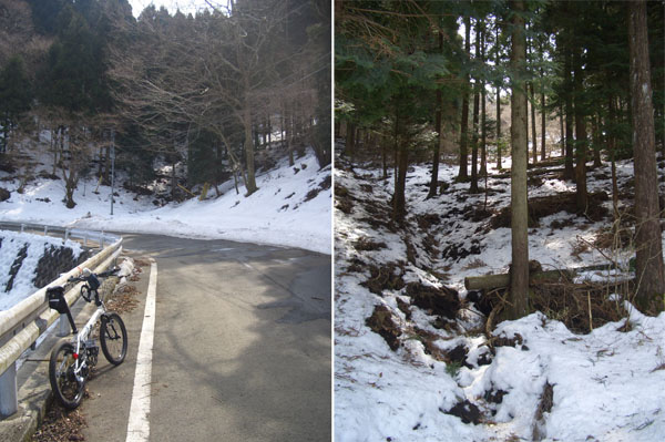反対側に少し下ったところに護摩屋敷の湧水があることを思い出したので向かうことにした。途中の山肌には結構な量の雪が積もっていたが路面上はところどころちょっと湿っている程度で走行に支障はないようであった。