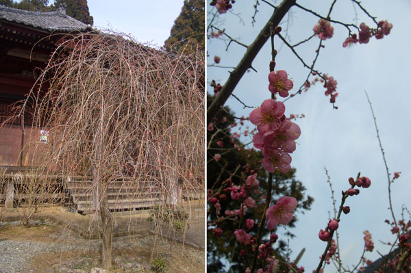 さらに下っていくと大日堂仁王門という門があったのでくっぐって中に入ると境内に枝垂れ梅があったがまだ蕾、右手に7分咲ぐらいの紅白の梅があったので撮影してみる。