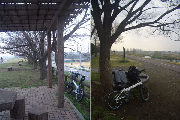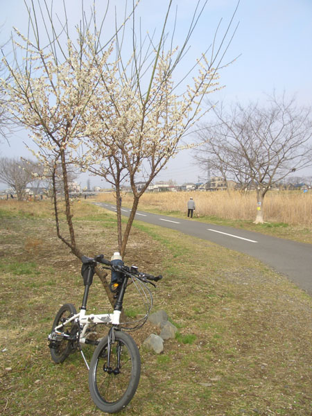 このあたりからはマイペースでくるくるとこぎつづけ京王テニスクラブ前のベンチで再び休憩。さらに府中、郷土の森付近で梅が見えたのでよってみようと思い土手下に降りて向かうがまだ開園時間前で入れず…鶯の鳴き声聞こえてきて良い感じ。