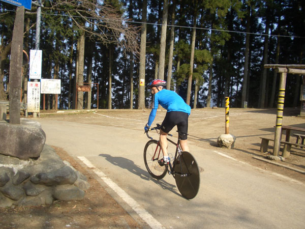 サイクリストが休憩していたので空気入れを貸してもらえないでしょうかとたずねると峠下に置いてきてしまったという…。しばらくあれこれ立ち話をして(八王子在住らしい)下で空気入れを借りることにした。