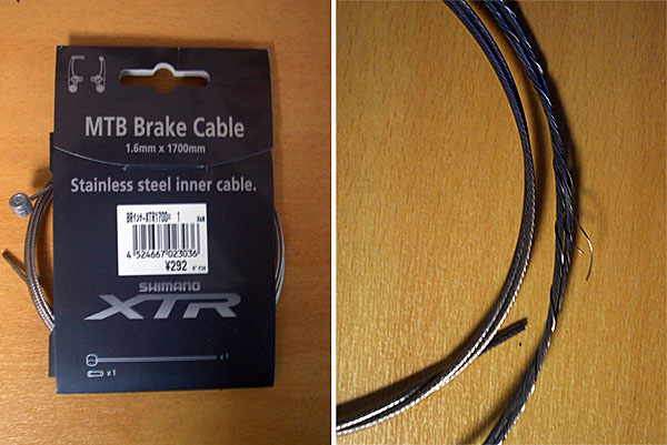 フロントブレーキのケーブルを交換する。インナーワイヤーがほつれてアウターワイヤーにこすれて動作がしぶくなっていたようだ。これじゃあブレーキシューも偏摩耗するわけだよ。