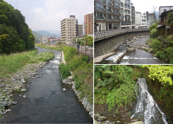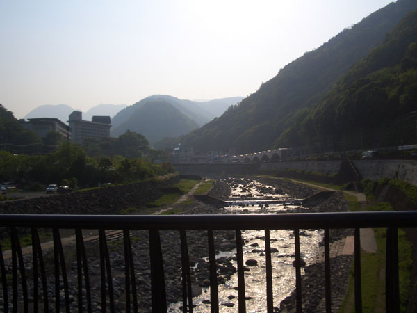 静岡県との県境を流れる千歳川に沿っていく。ほどなく温泉街の様相をていしてきた。