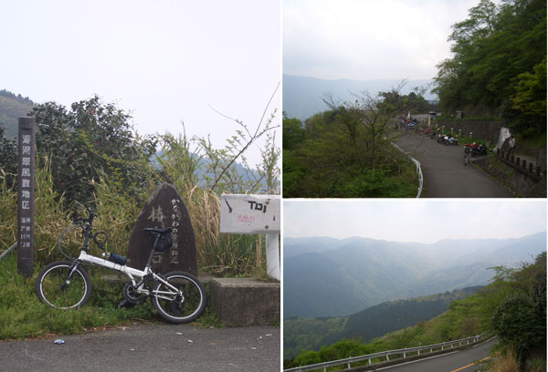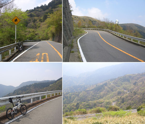 距離標識を見ながらさらに15km、16kmと上っていく。もう半分はすぎているようである。このあたりが一番きつい感じでさらによろよろと上っていく。途中景観がよさそうなところや滝やら名木跡への案内板が現れるたびに休憩し前方に丸いドームが見えてきた。あれが頂上かなと思ったがレーダードームだったようでさらに方向を変えて奥に本当の頂上らしき建物が見えた時はまだ上るのかと意気消沈した。ようやく大観山のパーキングエリアに到着。これでもう上らなくてよいのだとほっとした。路面状態も良いし傾斜もそれほどきつい箇所もなかったのだが大観山まで20kmほどずっとのぼりというロングなワインディングロードということで疲れた。