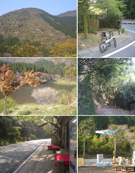お玉が池につづく遊歩道の入口で写真を撮っているとなにやら話しかけてくる人がいたので少しお話する。どこからきたのというから茅ヶ崎からというとこんな小さな自転車でよくきたなあと感心していた。軽いギヤを付けたりして改造してますからと付け加えておいた。どうやら脇のお店のご主人らしかったらしい。なんだか大の大人がこんなオモチャのような自転車に乗ってこんなところまできてしまうとは少し恥ずかしい気がしてきたがいいのである。ここから先は下りだからじゃあ気おつけてということでお別れして坂道を下っていくとお玉ヶ池前に到着。後に見えるのは二子山らしくなんとなくユーモラスな山だ。