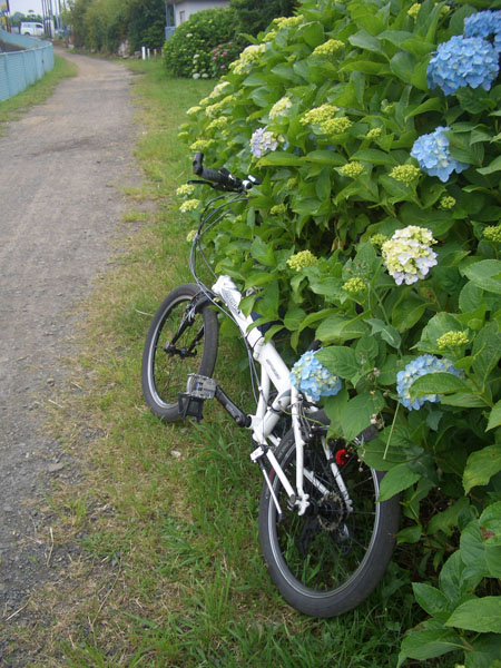 左岸の砂利道を走行していくとところどころにあじさいの花が咲いていた。のんびりと川沿いを進み東名高速の高架下を抜けてR246号線の高架をくぐると舗装路になった。
