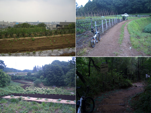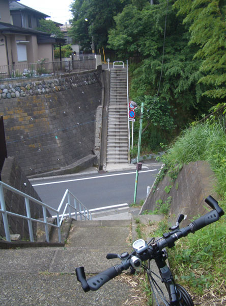 右折して尾根沿いに進むと次第に道が細くなり農道となった。さらに先へいくと何やらハイキングコースのような狭い根かぶのあるダートをがたごとと走向していく。スズメバチに注意などという看板が目立つ。ほどなく階段が現れたので自転車を降りて押して下る。脇には“町田市立成瀬尾根1号緑地”という看板が立っていた。ちょうど今通ってきた尾根が東京都と神奈川県の境界のようであった。住宅地沿いにでると舗装路となりしばらく進むと前方に道を挟んで急な階段が出現した。