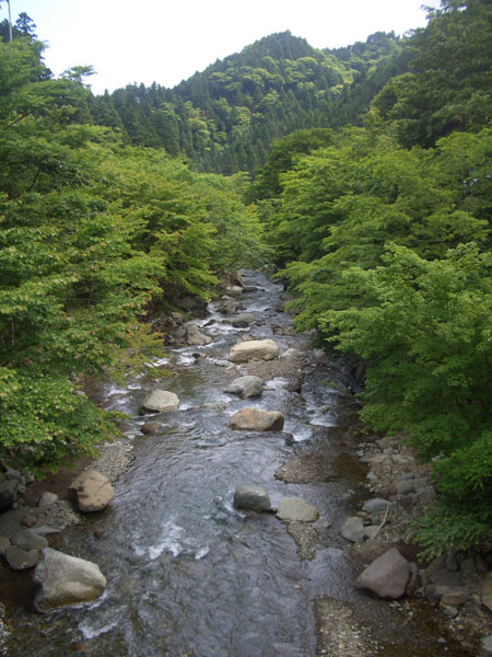 BOSCOキャンプ場前を通過し秦野市と清川村の境界あたりの吊り橋の下の渓流に降りてみる。釣りをしている人がいた。10分ほど休憩して先へと下っていく。