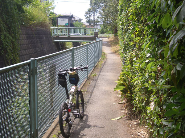 今回は鶴見川の右岸を走行していくことにした。砂利道をがたがたと走行して第三京浜高架下、川向橋を通過し横浜線の線路沿いにしばらくいく。途中でボトルが落下…。(もうちょっと対策しないと)鴨居にちかづくと舗装路となる。なにやらラジオ体操をしている集団の中を通り抜けて鴨池人道橋に到着。さらに右岸を走行し落合橋が見えてくるようになると再び砂利道となった。(そのまま直進すると恩田川沿いになる)