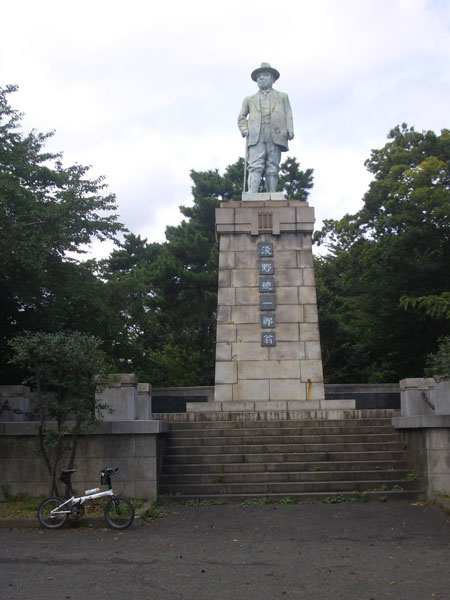 浅野学園内に入って左手の急な坂道をのぼると駐車場に到着。奥には京浜工業地帯の埋立などで有名な浅野総一郎の銅像が建っていた。