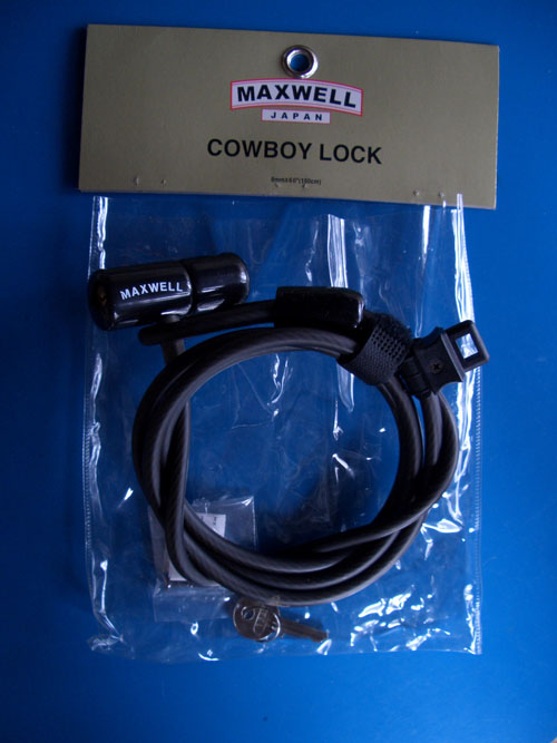鍵はカウボーイロック(重量:約420g)といって長くワイヤー状になっていて電柱等の構造物にくくりつけるようなものでちょっと普段使いには面倒かもしれない。もう少し簡易な物と使いわけるのがよさそうだ。
