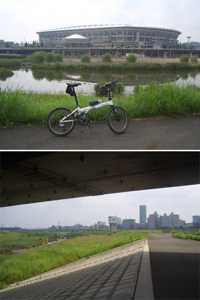 新横浜公園周辺の探索はこの辺で終了することにして亀の甲橋を渡り鶴見川左岸の土手を走行していく。