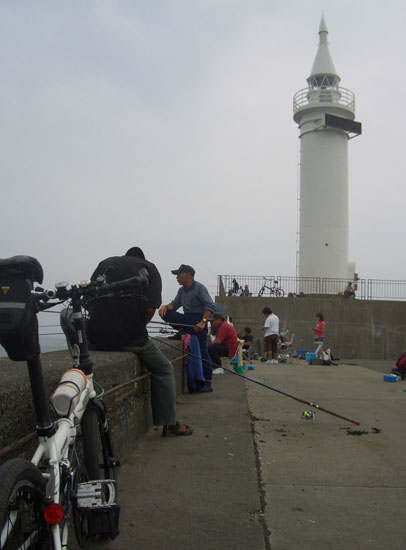 ここまでくれば江の島は目と鼻の先だ。橋を渡って白灯台あたりまでいってみる。灯台の下の堤防では釣人でいっぱいだ。ちょっとながめているとおばさんが何か小魚を釣り上げて喜んでいた。結構釣れるみたいだ。