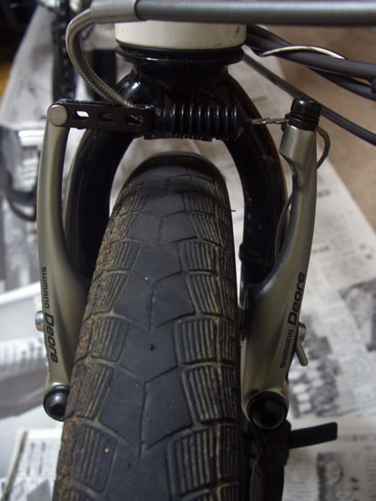 まずはブレーキワイヤーを外して5mmのレンチでぐりぐりとして外す。右側のブレーキ台座に若干錆びが浮いていたので擦っておく。購入したDeoreのブレーキは低グレードだけど元からついていたのよりも滑らかに動くし精度も高いようだ。