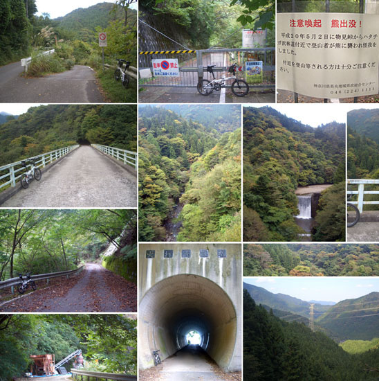 気持ちよく下って札掛橋を通過しちょっとスローダウンする。この先に唐沢林道への分岐があるはずなので注意して進むとほどなく二分岐地点に到着した。右手の坂を下り三脚を立てて写真撮影している人の脇を抜けると林道のゲートがあった。ここにも熊出没注意とあった。物見峠からハタチガ沢林道付近で人が襲われたというような事が書かれていた。ちょっと危険な香りがしたが構わずに進入してみることにした。(ここから先は自己責任ということで…)