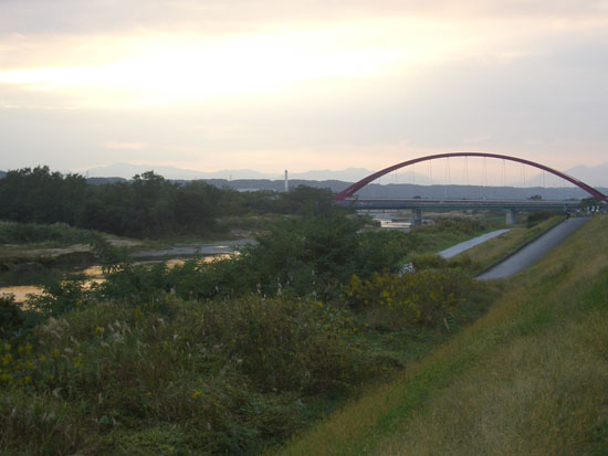 中央高速高架先の河川敷公園手前のトイレ前で又休憩。ここから先はちょっといままでの区間と雰囲気が変わってちょっとトリッキーになってくる。奥多摩などに向かう場合は脇を走っている新奥多摩街道や奥多摩街道を走行していくほうが楽かもしれないなあなどとおもいながら貝殻橋渡り立川公園を抜けて日野橋、立日橋を抜けて中央線高架下をくぐると赤いアーチが印象的な多摩大橋が見えてきた。このあたりまでくると随分と遠くまできちゃったなと毎度毎度感じる。
