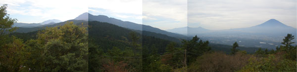 ここは峠ではないようでちょっと下って静岡県に入って少し上ったところに峠はあった。標高759mでヤビツ峠よりは若干低いようである。隣りに足柄之関跡、向かいに聖天堂などがありハイカー等で結構賑わっていた。更に先へ行くと足柄城址への階段があったので上ってみると石碑越しにドーンと待望の富士山を望むことができた。
