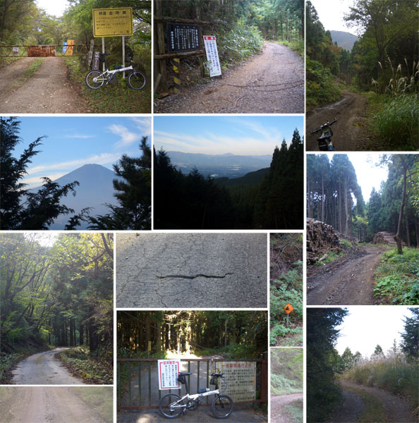 30分ほど休憩後に金時林道に向かうことにした。金時山への登山道に向かって少し上っていくと右手にゲートが現れた。ゲート前に停めてあった車の人と少し話しをして(山芋掘りにきたそう)林道に突入。はじめのうちは固くしまった土道だったがほどなく凸凹の砂利道となったので腰を浮かせて慎重に下っていく。眺望はほとんどなく山の中をただひたすら走行していく。ときおり自衛隊の演習かなにかの砲弾の音が鳴り響いていた。