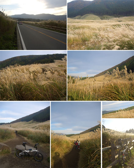 気持ちよく下りきるとR138号線につきあたり車の切れ目をついて横断した。右折して渋滞している車の横を注意しながらゆっくり下っていく。仙石原交差点に近づくとさすが観光地らしく人影が多くなってきた。交差点を右折しゆっくりと走行していくとほどなく仙石原のススキ草原に到着した。薄曇りだったが時々夕陽に照らされたススキが綺麗いだった。