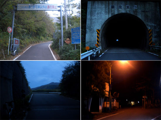 薄闇の中を路面に注意しながらスピードがですぎないように下っていく。途中にゲートがありガイド本ではゲートをくぐって川入林道を下っていくコースになっていたがすでに暗いので今回は直進してわかりやすそうな黒白林道を下ることにした。ほどなく地蔵堂前に到着したようだ。ちょうどバスが発車するところだった。時計をみると5時26分となっておりあたりは街灯に照らされていたが真っ暗となっていた。