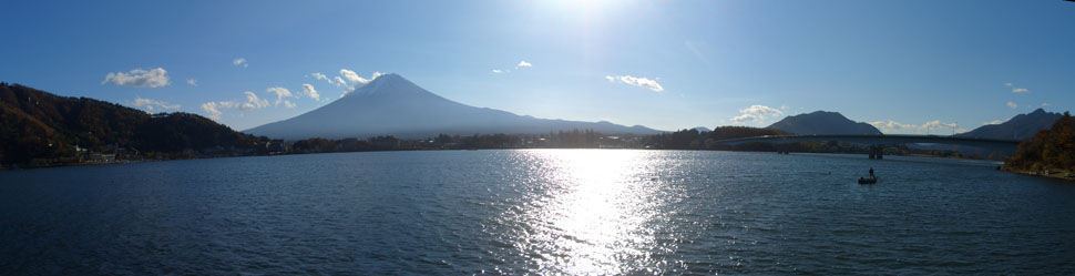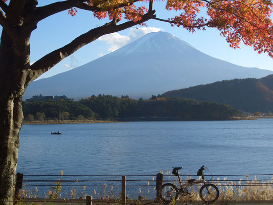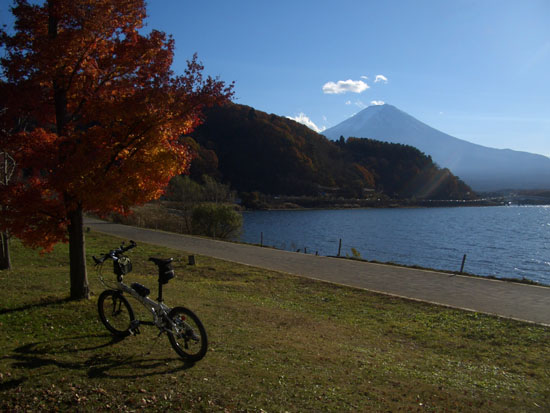 なにはともあれへろへろになりながらもようやく河口湖に到着した。(13:00頃橋本駅前から6時間あまり…)腹が減っていたので昼食を食べて中休止し河口湖南岸をのんびりと走行することにした。遊歩道からは逆光ながら雄大な富士山が湖越しに見えていて気持ちよい。