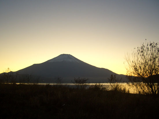 山中湖交流プラザきららに到着するとすでに日没後のようで神々しい富士山が湖越しに浮かんでいた。(惜しいもう数10分早く到着していれば美しい夕景が望めたのに…)