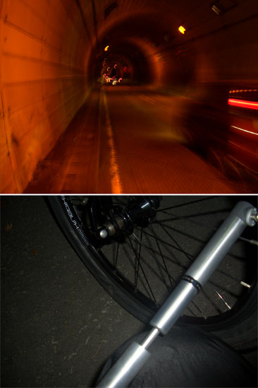 山伏トンネルまでよろよろとのぼるとオレンジ色の光の先の闇に向かって下っていく。山の中とはいえさすがに国道なので数100mおきに街灯があった。スピードをださなければそれほど危険ではないようだななどと思いながら下っていくと何やら前輪からブシュッと異音がしたかと思うとみるみる空気が抜けてしまった。