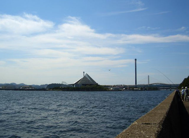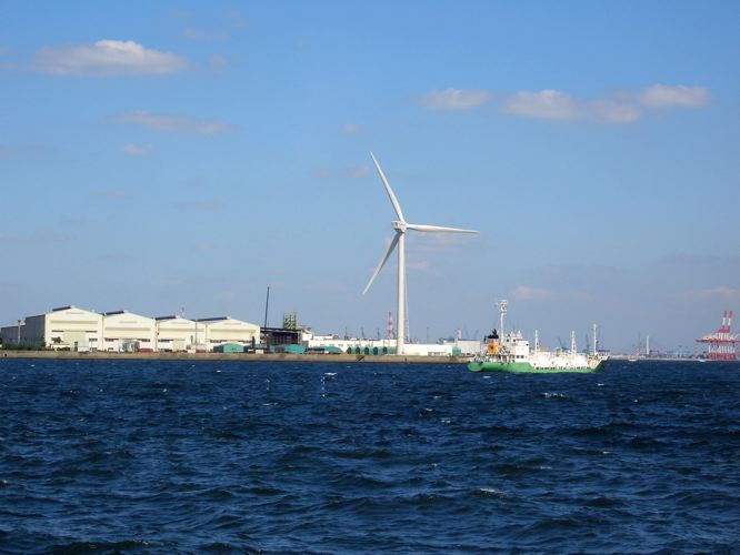 ここで更に海よりの道を走りたくなったので左折することにした。流通団地前という信号をそのまま直進するとほどなく行き止まり。リネッツ金沢というプール施設らしき建物があった。しかたなく引き返してすぐの道を左折してしばらいくと公園らしきものがあったので休憩する。堤防ごしに東京湾を見晴らすことができた。左手には巨大な白い風車、前方には船やぼんやりと対岸の千葉県の山並みが浮かんでいる。釣りをしている人もいた。
