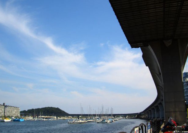 くるくるくるくるとこぎ続け南部卸売市場前を通過し鳥浜に到着した。ここを左折して横浜ベイサイドマリーナへ向かう。まだ朝早いために開店していないようだ。海辺のマリーナを眺めてから先へ行くことにする。