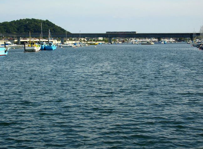 景色を堪能した後、野島をでて夕照橋を渡り平潟湾に向かう。湾の中央をモノレールが横切り湾沿いに奥に続いていた。湾沿いの遊歩道をのんびりと走行していると金沢八景駅前に到着。湾の端に到達した。前方に見える琵琶島に上陸してみるとここでも先端で釣りをしている人がいた。道路の反対側には瀬戸神社があった。