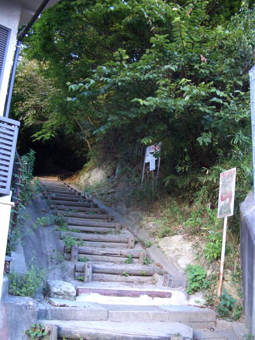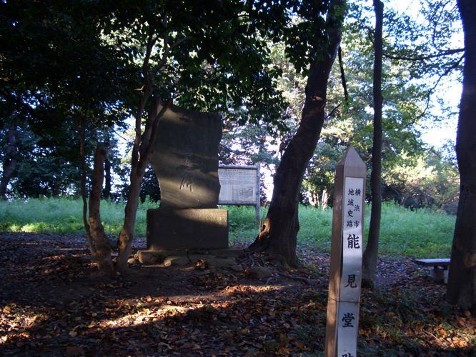 自転車を看板の前に止めて住宅脇の急な階段を上っていく。この時点でまたもや右膝の外側の筋が痛みだしてしまった。しばらくのぼっていくと二つに分岐していたので右側を進むと能見台跡という石碑がたっていた。鬱蒼と木が生い茂っていたので眺望はあまりよくないようだ。