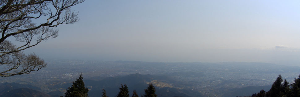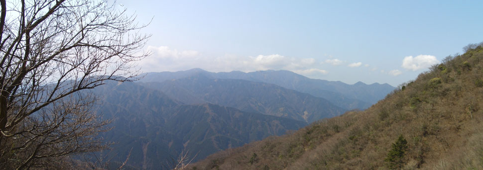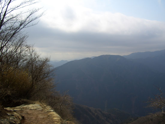 さあ次ぎは大山へアタックだ。ヤビツ峠から大山山頂まではイタツミ尾根という尾根道を登っていくようだ。時刻はまだ12時前なので2時すぎか遅くとも3時までに戻ってこれるだろうなどと考えながら急な階段を上りはじめるが少々左膝が痛い…。ほどなく大山まで2.4kmという標識が現れる。ということは往復で約5kmも歩かなければならないということだ。尾根道ということで右側は急な崖となっており左側は多少緩やかな感じ。アップダウンを繰り返して鎖場などをこなしてよろよろと歩いていると千葉からきたというおばさんと少し話しをする。チョコレートなどを頂いてしばらく一緒にのぼっていくと左側に展望の開けた場所にでた。丹沢の山並みの向こうに富士山も見えるようなのだがあいにく雲がくれしてしまったようだ。ここまで階段も木製だったのでSPDシューズでもほとんど問題なく歩いてこれた。(石段だったらちょっと厳しかっただろう)